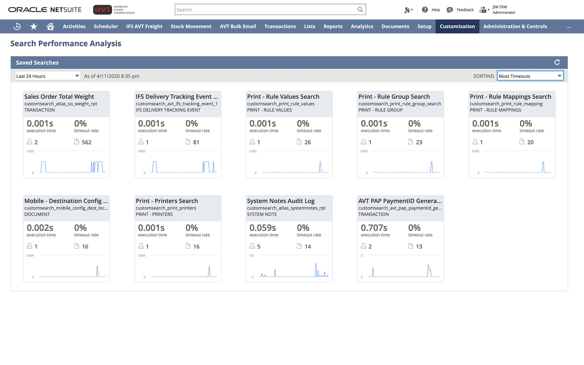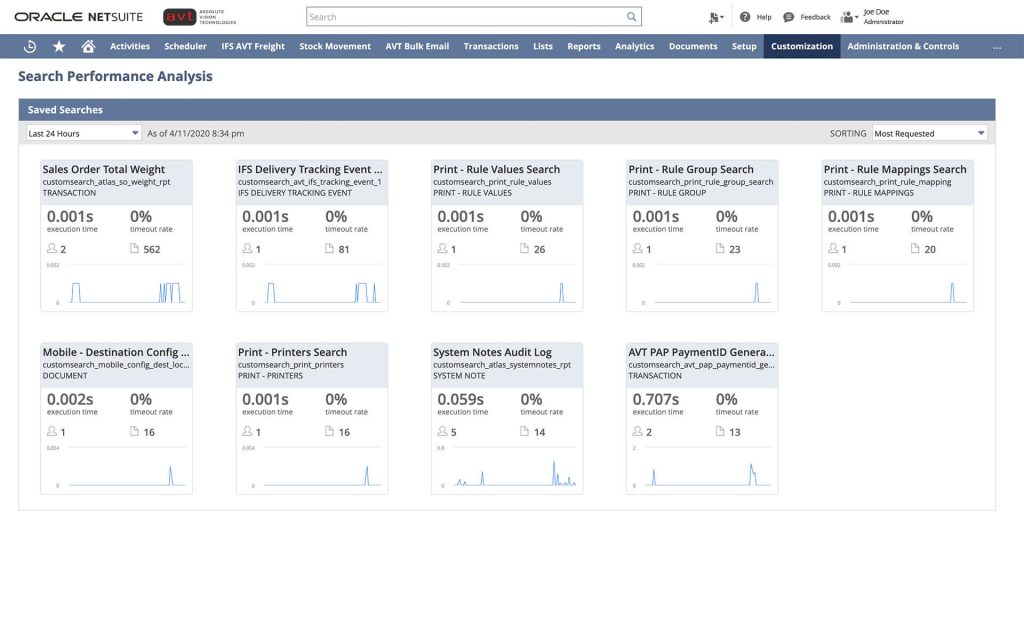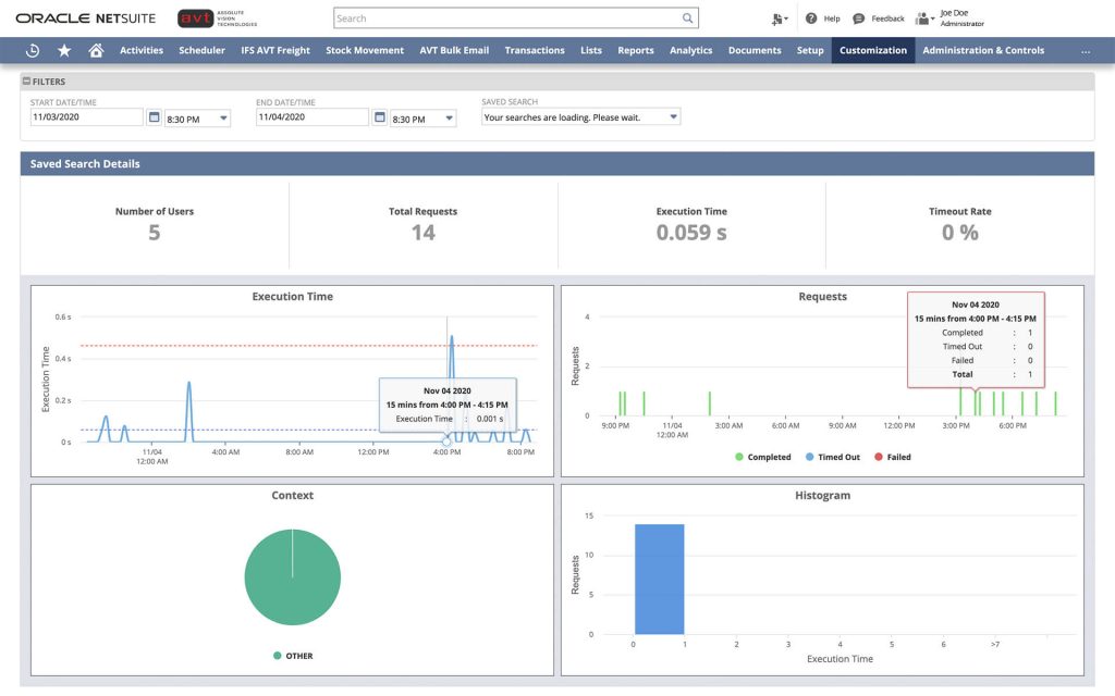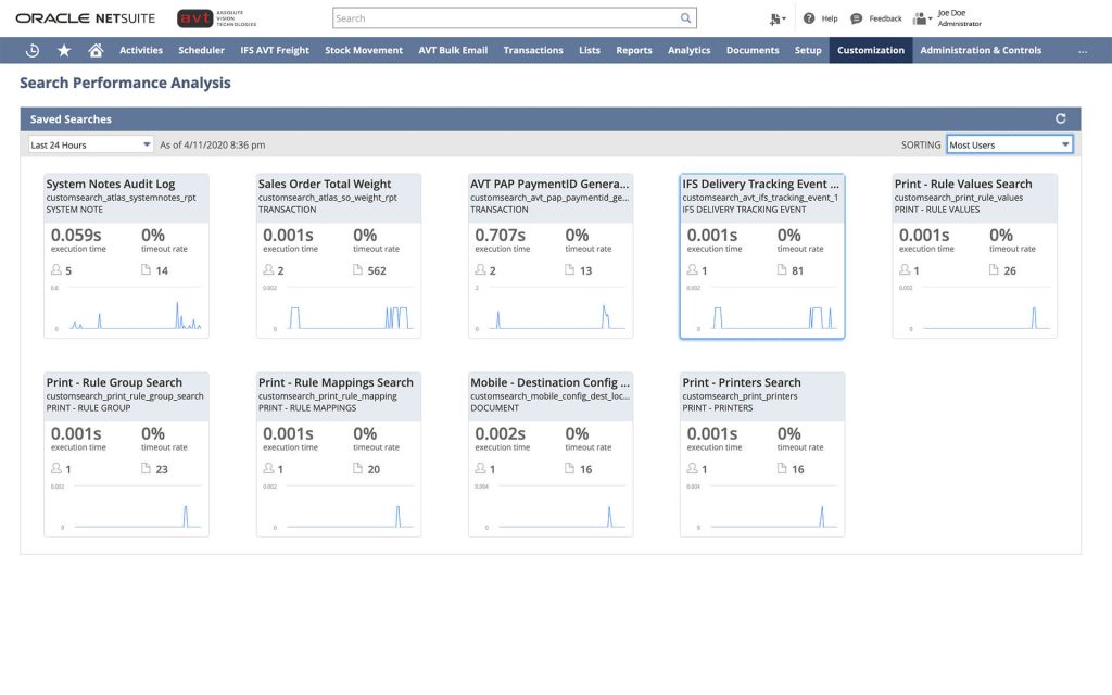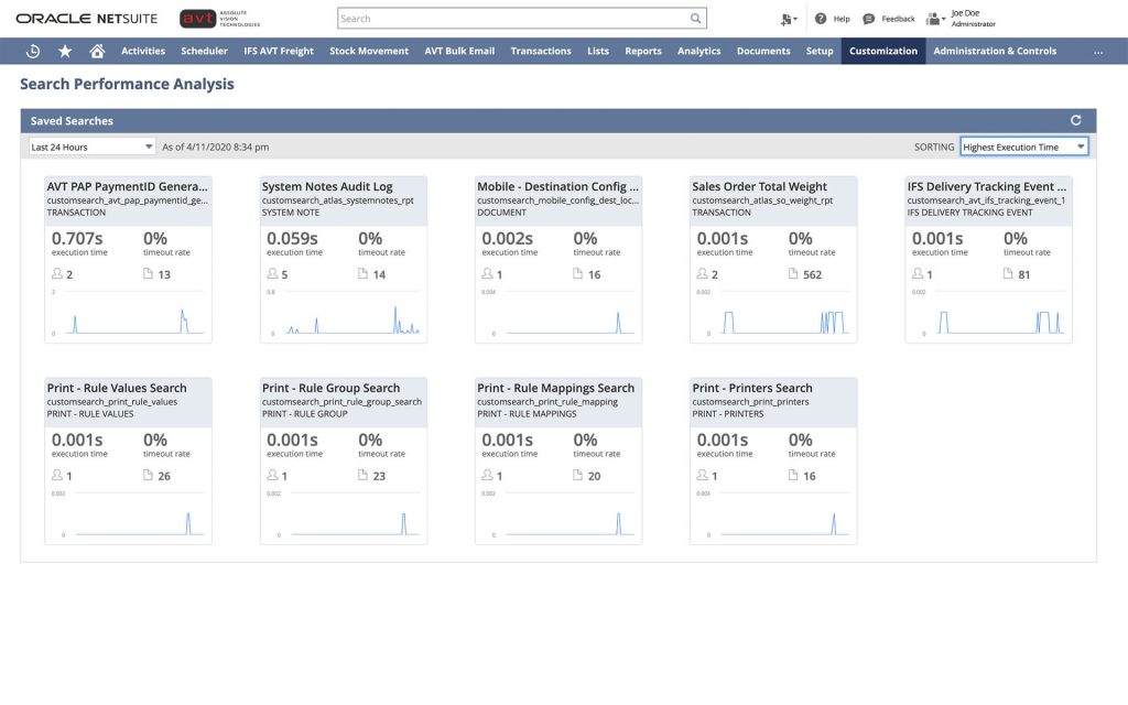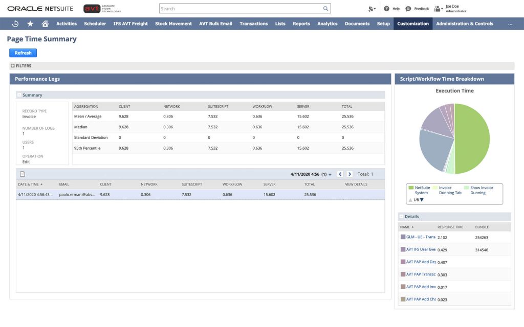 The Application Performance Management (APM) SuiteApp enables you to see and manage the performance of your NetSuite customizations and business critical operations. You can use the dashboard, data visualizations, page time summary, script analysis, and script queue monitor to review and improve the speed of the NetSuite UI.
