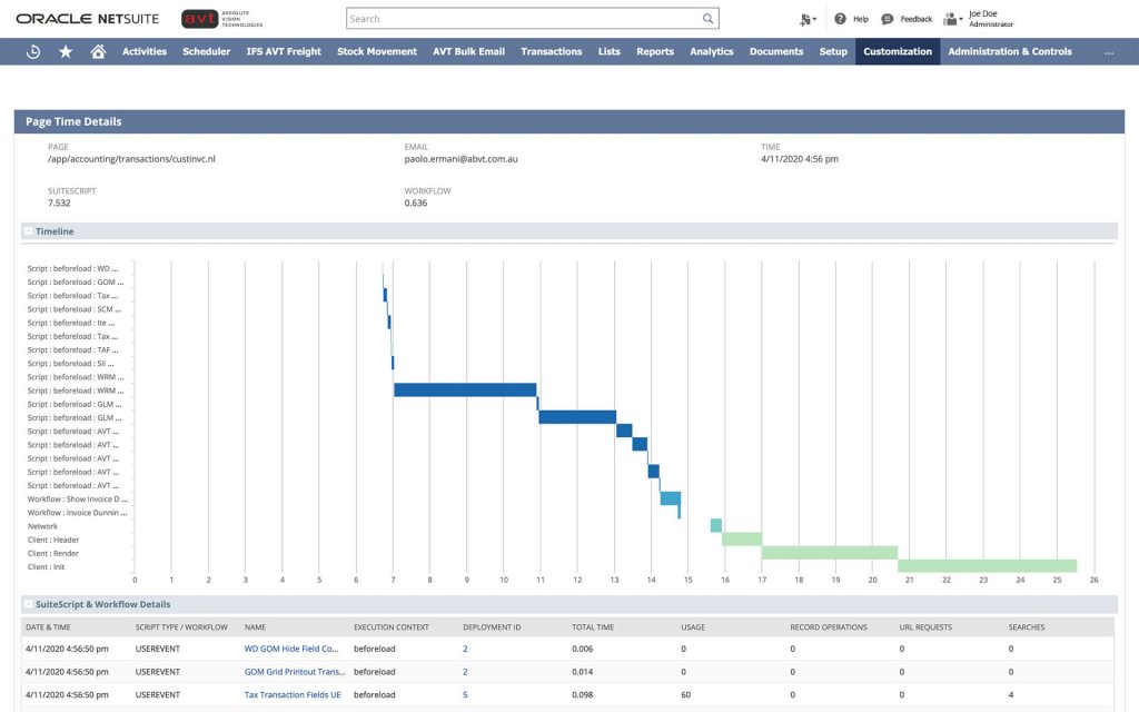 - Can determine which script or workflow is causing a high SuiteScript or workflow time.