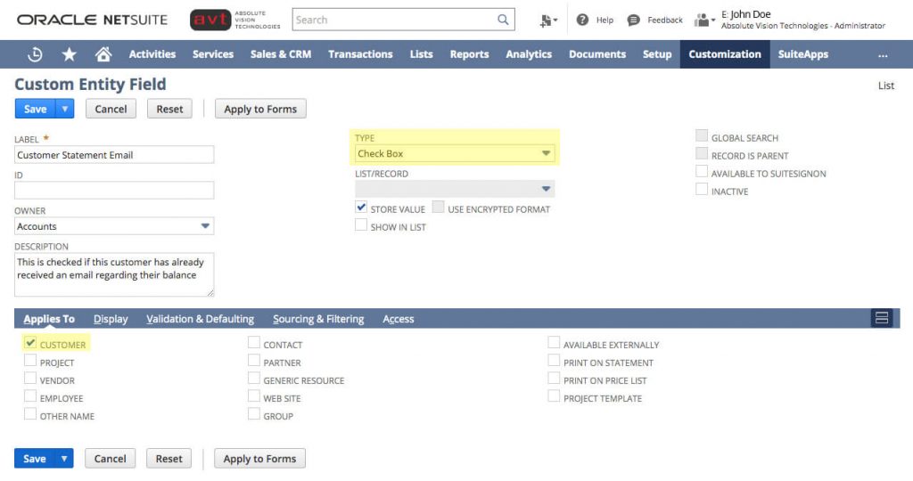 - 1. Navigate to Customization -> List, Records, Fields -> Entity Fields -> New
