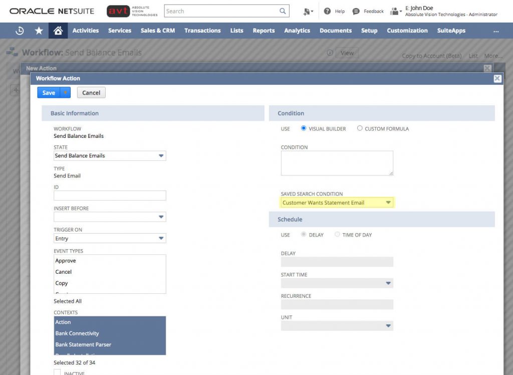 NetSuite allows companies to send Automated Statement Emails instead of a single email every period of time. Here is how you can easily set up a workflow in NetSuite that will allow you to automatically send customer statements.